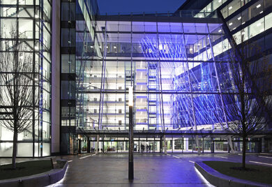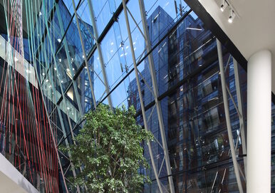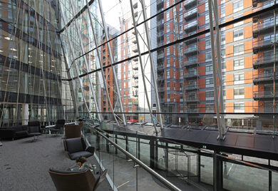 McMullen Facades completed the design, manufacture and installation of the complex glazing package, a key part of which was the striking sloped glazed entrance that creates an attractive atrium and winter garden. The team also delivered the curtain walling to the internal walls of the atrium.